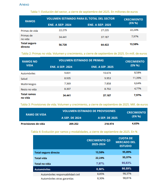 Por su parte, la categoría “resto no vida”, que engloba las pólizas empresariales y ramos como decesos, creció de un año para otro un 4,77% y aportó 8.702 millones. El negocio de vida, reflejado en los ingresos por primas, aumentó un 22,24% en términos interanuales. El volumen del ahorro gestionado por parte de las aseguradoras se elevó un 4,65%, de manera que las provisiones técnicas se situaron en 218.974 millones a cierre del tercer trimestre de 2025. A continuación, se ofrece la evolución de los diferentes ramos.
